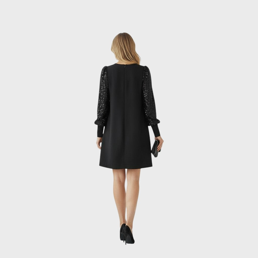 Modelul Elena reprezintă un echilibru perfect între „mica rochie neagră” clasică și extravaganța de seară. Această rochie este definită prin contrastul dintre corpul minimalist, neted și mânecile expresive, care sunt acoperite pe întreaga lungime cu paiete strălucitoare. Este o piesă creată pentru femeile care doresc să strălucească, dar în același timp cer confort și sofisticare.